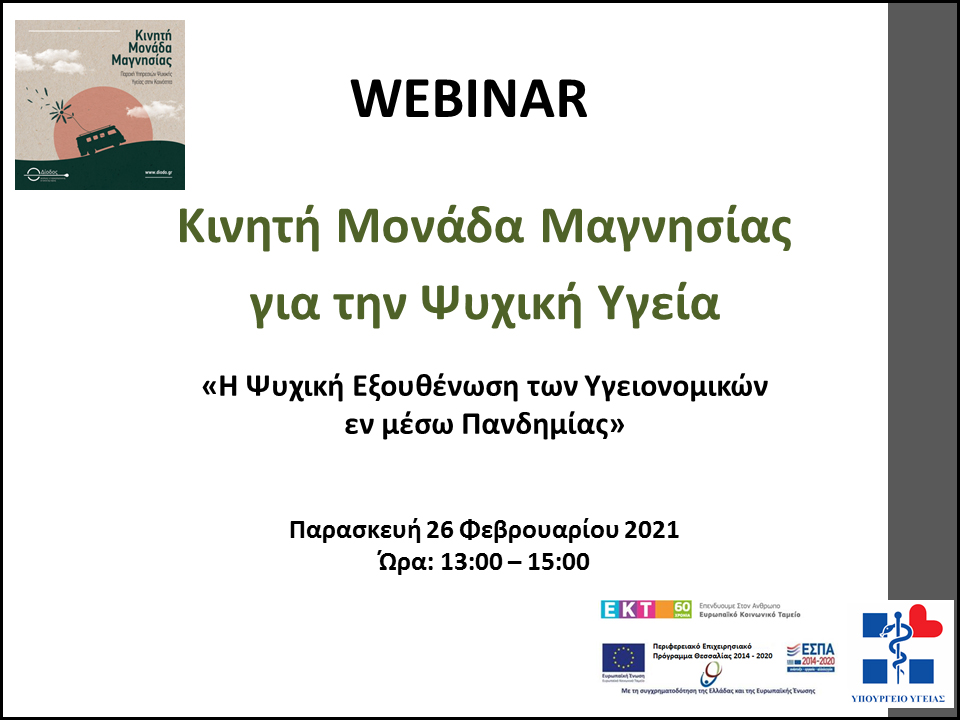 23/02/2021. Διαδικτυακή εκδήλωση από την Κινητή Μονάδα Μαγνησίας για την Ψυχική Υγεία με θέμα «Η Ψυχική εξουθένωση των Υγειονομικών εν μέσω Πανδημίας»